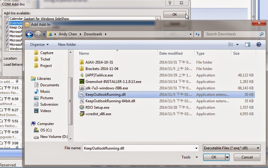 (這是讓下一步的增益集能正常運作)至下面連結下載 KeepOutlookRunning.dll ,依電腦選擇64位元或32位元的(不知道的話就先都下載)。